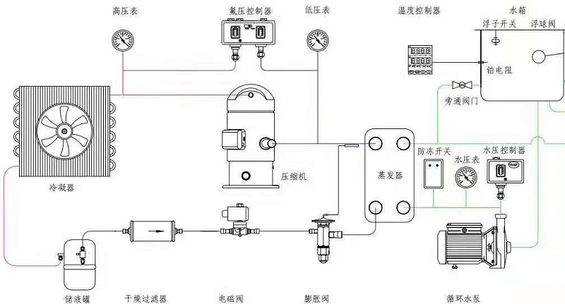 根據(jù)制冷系統(tǒng)原理,低溫低壓的液態(tài)冷媒在蒸發(fā)器里面與周圍水進(jìn)行熱交換蒸發(fā)器吸收水的熱量,蒸發(fā)成低溫低壓的氣態(tài),蒸發(fā)過程中冷媒溫度不變,低溫低壓氣態(tài)的冷媒進(jìn)入到壓縮機(jī),經(jīng)壓縮機(jī)壓縮,被壓縮成高溫高壓的氣態(tài),然后進(jìn)入冷凝器,在冷凝器里與室內(nèi)的介質(zhì)進(jìn)行熱交換,高溫高壓的氣態(tài)的部份熱量被介質(zhì)吸收,介質(zhì)溫度升高,冷媒放熱冷凝器變成高溫高壓液態(tài),冷凝器過程溫度不變,然后進(jìn)入膨脹閥進(jìn)行節(jié)流,節(jié)流是迅速降溫的過程,冷媒變成低溫低壓的液態(tài),此過程后的冷媒再進(jìn)入到蒸發(fā)器進(jìn)行換熱蒸發(fā),從而實(shí)現(xiàn)制冷系統(tǒng)的整個(gè)過程,這種循環(huán)是連續(xù)進(jìn)行的,水才得以連續(xù)不斷的制冷。