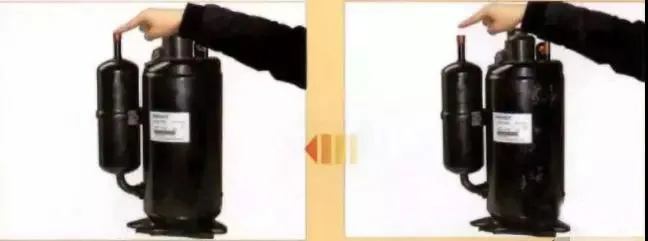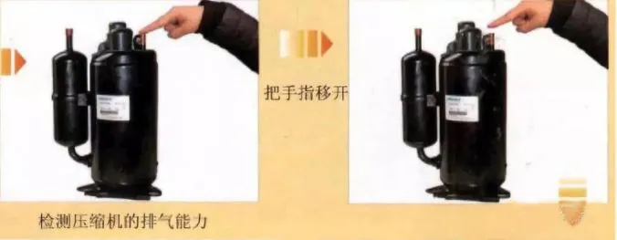 用手指按住吸氣管,若感覺(jué)到有吸氣壓力, 則表示壓縮機(jī)正常。當(dāng)把手指移開(kāi)時(shí), 如果沒(méi)有感覺(jué)到任何吸力,說(shuō)明壓縮機(jī)沒(méi)有吸氣能力。如下圖所示: