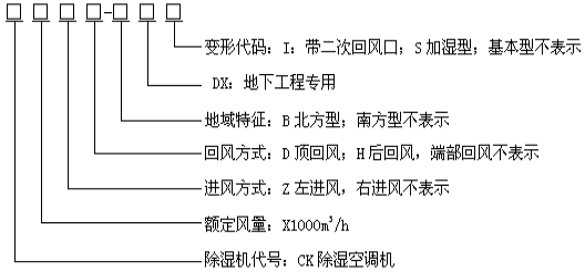 型號示例: CK12-DX 表示名義風(fēng)量為12000m3/h,回風(fēng)方式為端部回風(fēng)的南方型地下工程用除濕空調(diào)機(jī),面對機(jī)組控制器,回風(fēng)口在右側(cè)。